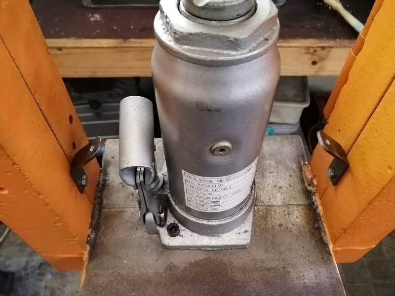 Picture above made an extension  to the right side of the frame to stabilize it when using it at full pressure , a 150 x 50x 50 mm x 6 mm angel welded to the frame. Also made an knob for  activating or releasing pressure when operating the press. September 2020